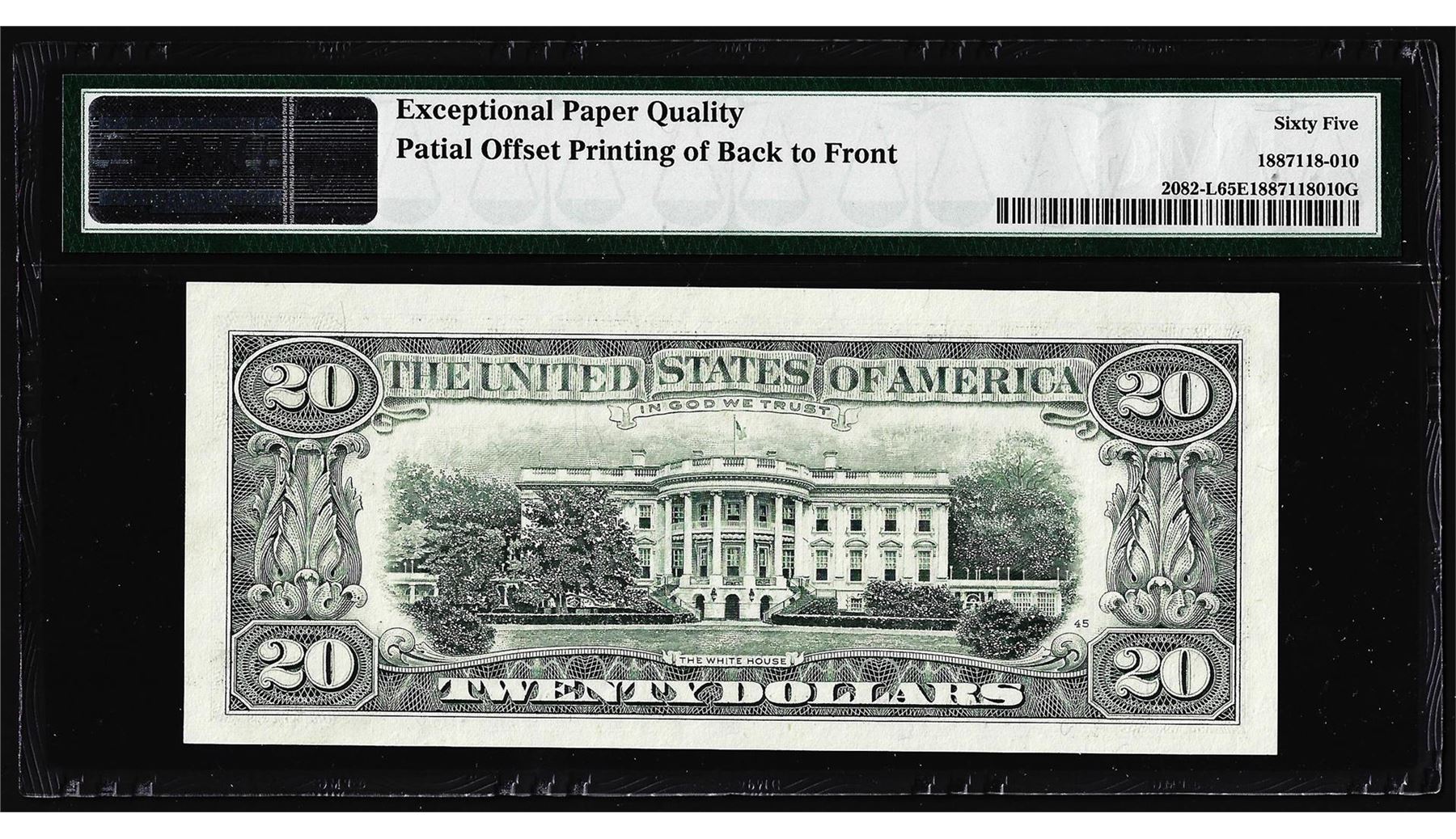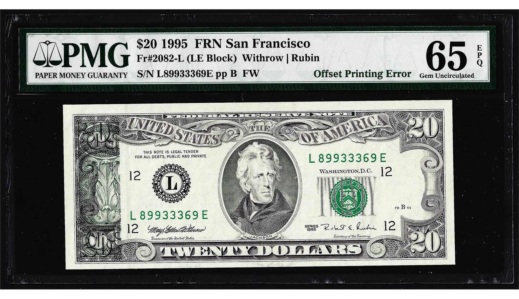One 1995 $20 Federal Reserve Note San Francisco Offset Printing ERROR PMG Gem Unc. 65EPQ. PMG Certified.