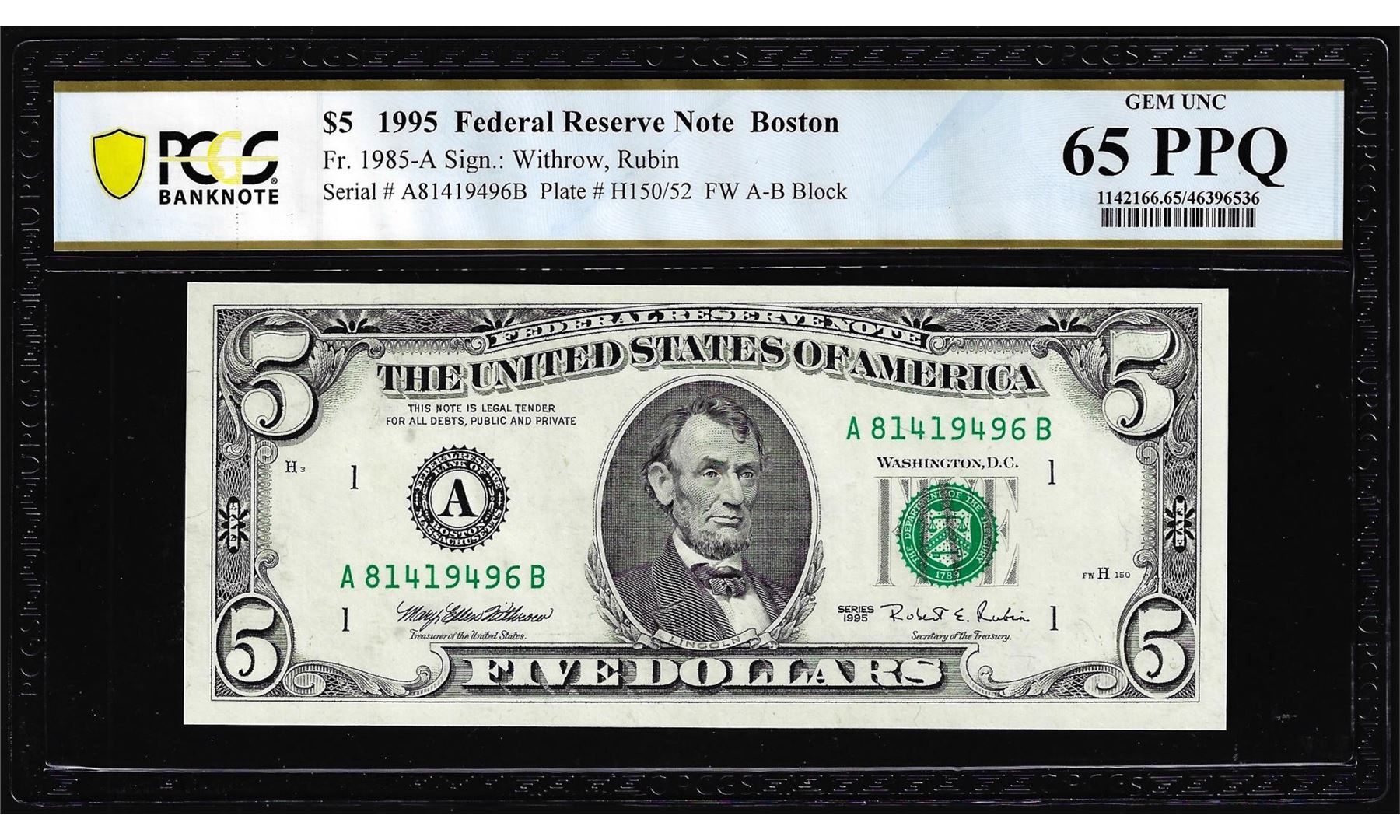 One 1995 $5 Federal Reserve Note Boston Fr.1985-A PCGS Gem Uncirculated 65PPQ. PCGS Graded.