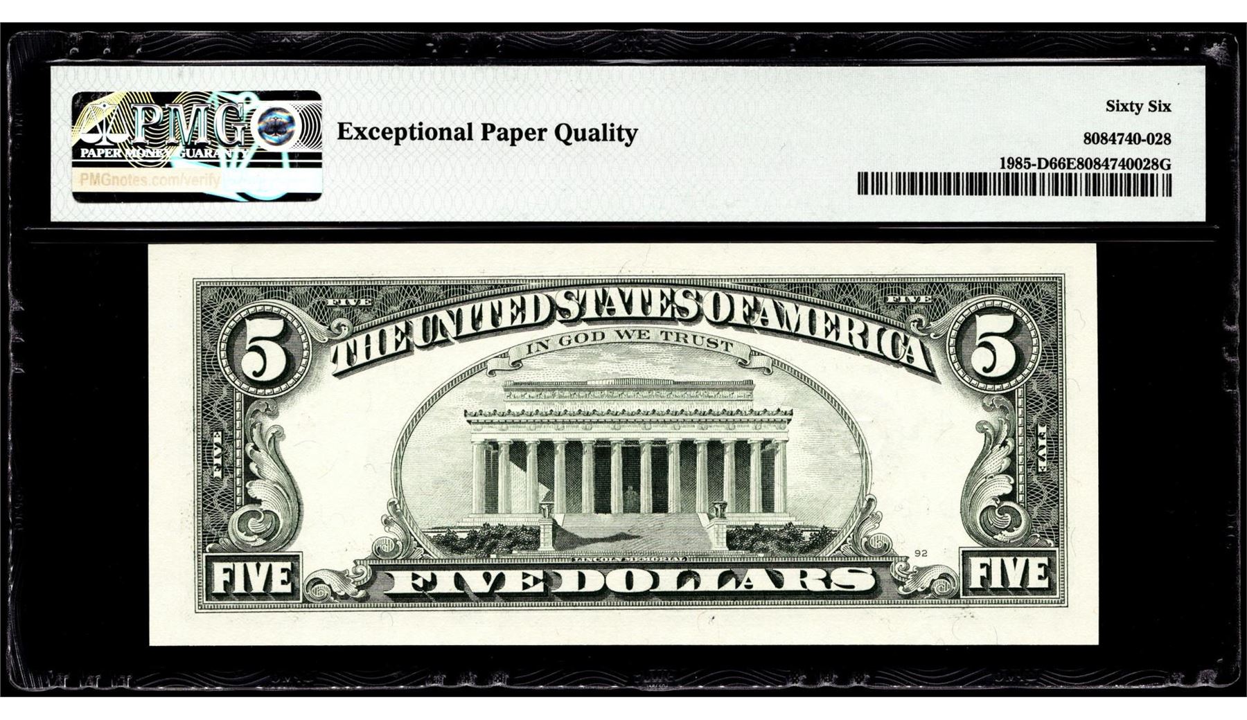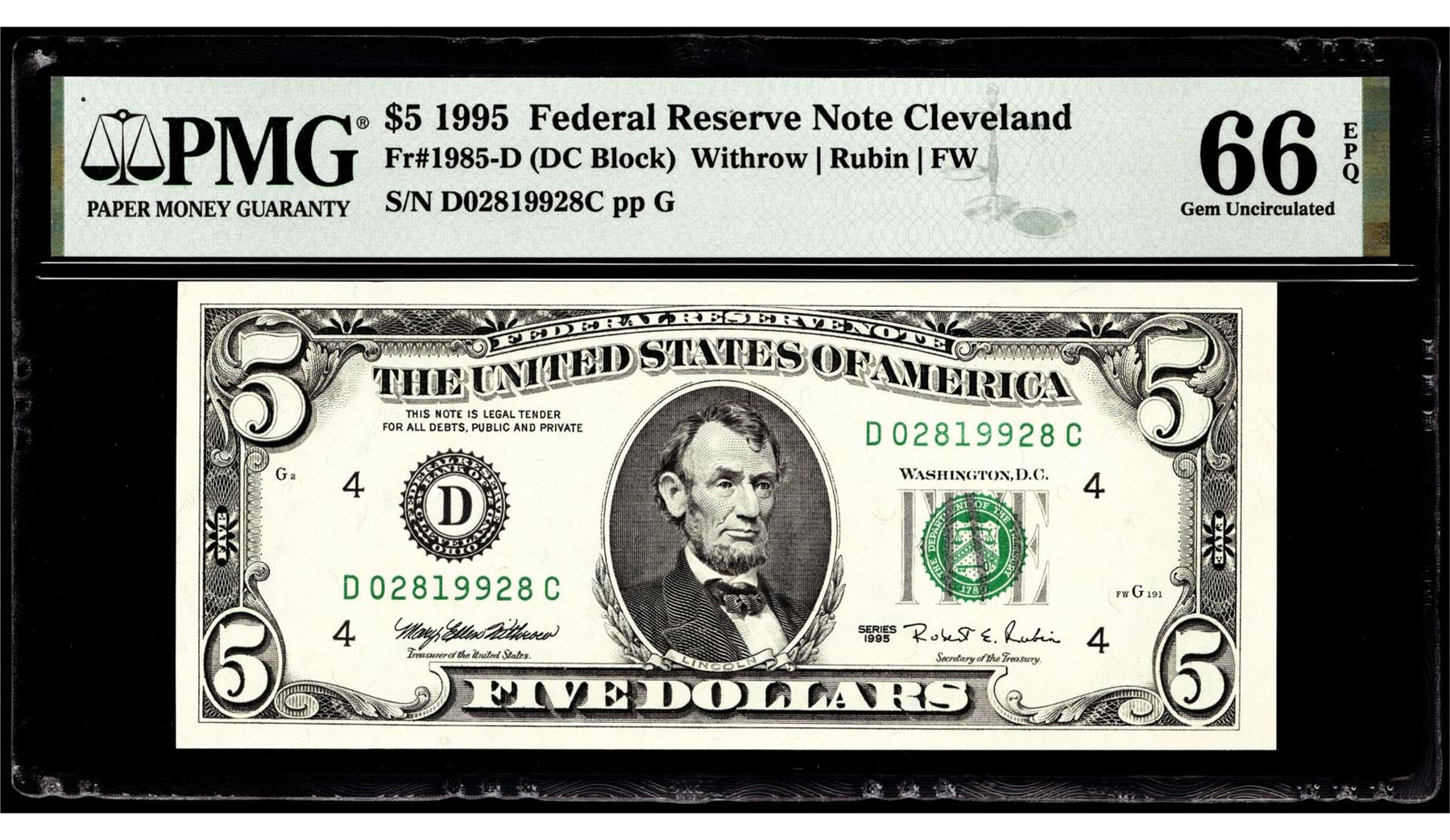 1995 $5 Federal Reserve Note Cleveland Fr.1985-D PMG Gem Uncirculated 66EPQ