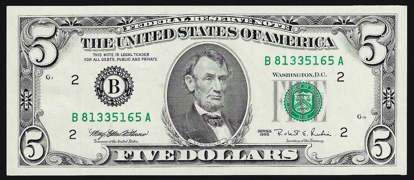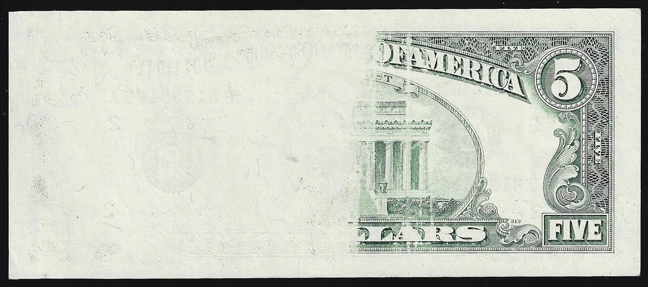 1995 $5 Federal Reserve Note Insufficient Inking ERROR