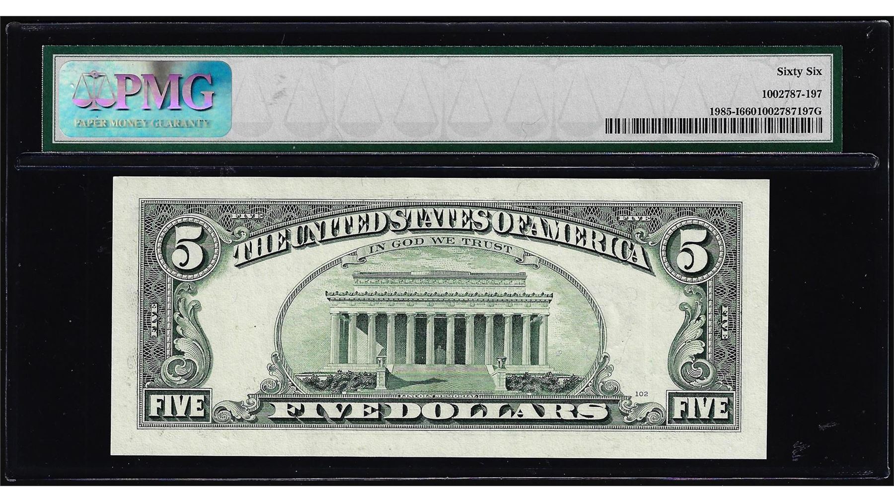 One 1995 $5 Federal Reserve Note Minneapolis Fr. 1985-I PMG Gem Uncirculated 66. PMG Certified.