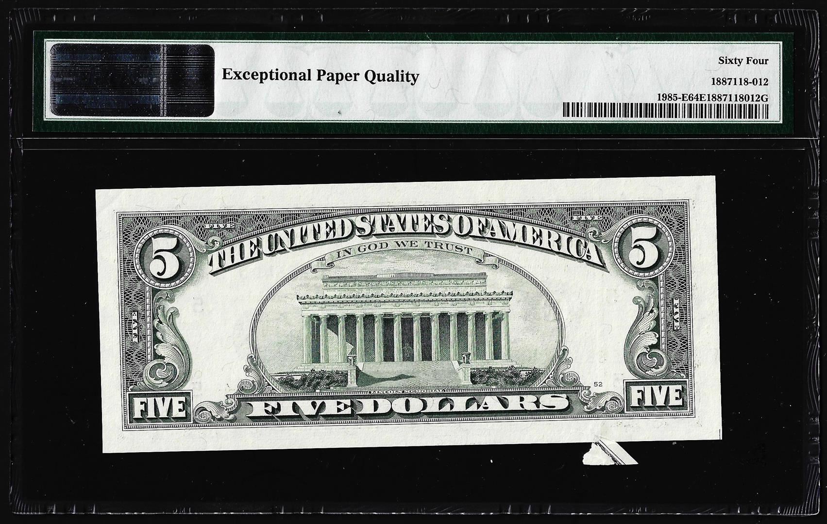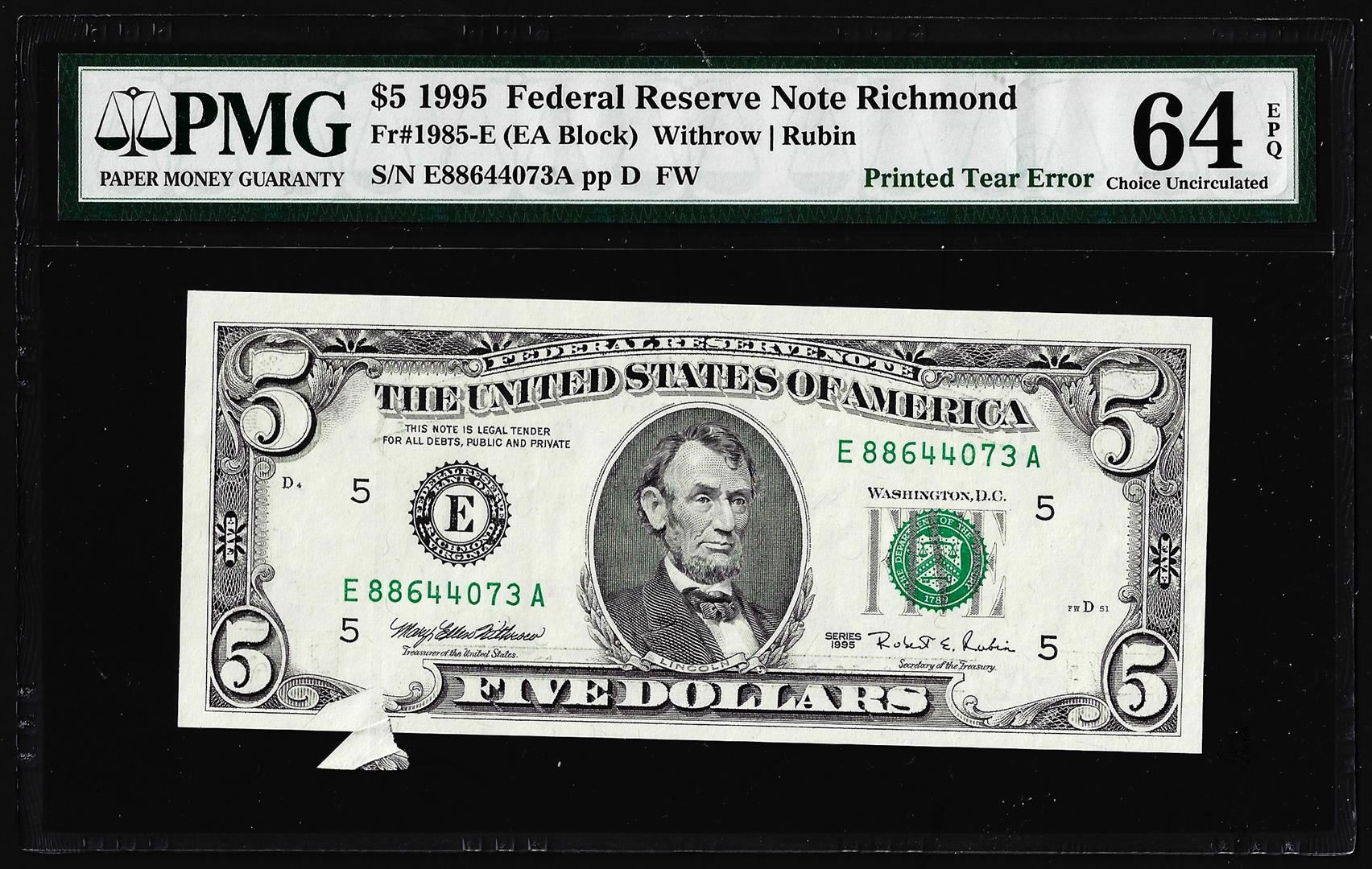 One 1995 $5 Federal Reserve Note Printed Tear ERROR PMG Choice Uncirculated 64EPQ. PMG Certified.