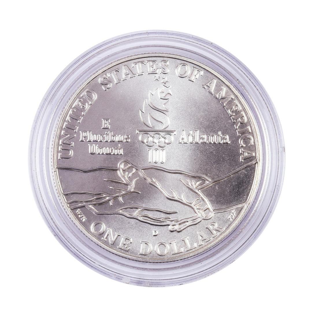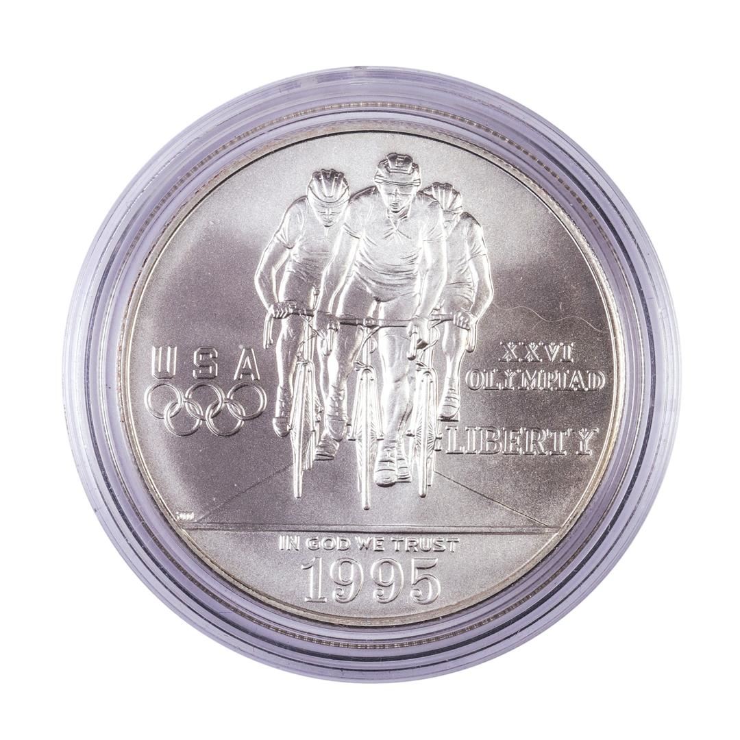 One 1995-D $1 Olympics Cycling Commemorative Silver Dollar Coin.
