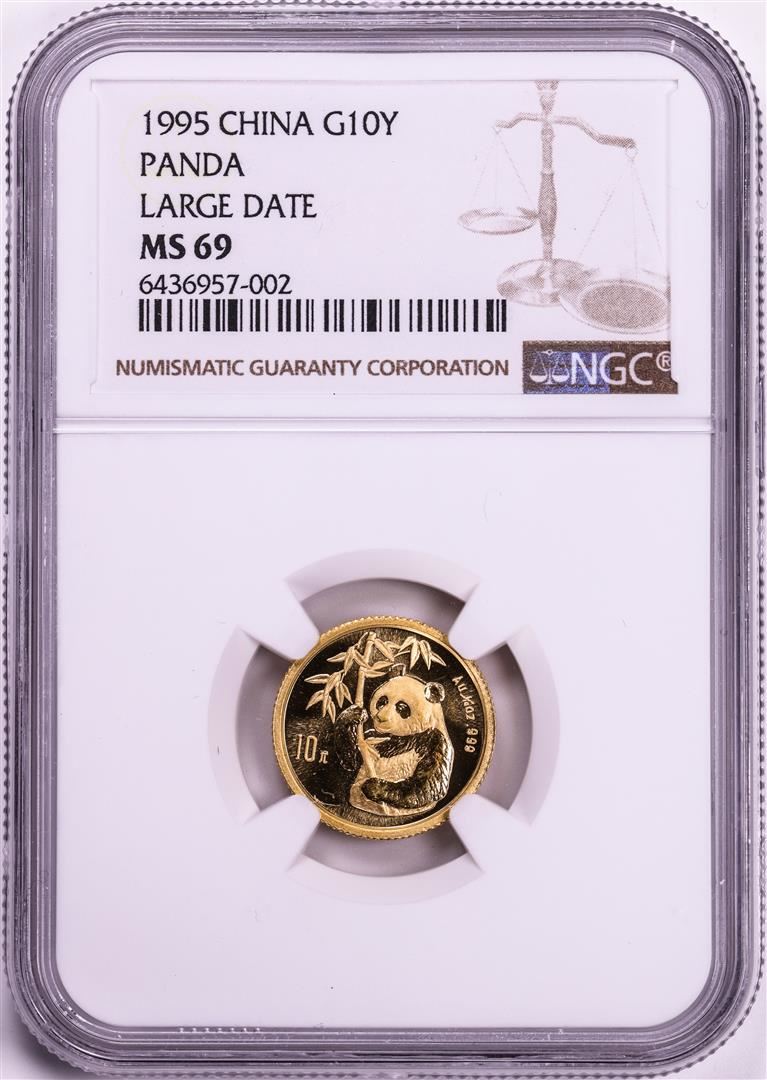 One 1995 Large Date China 10 Yuan Panda 1/10 oz. Gold Coin NGC MS69. NGC Certified.