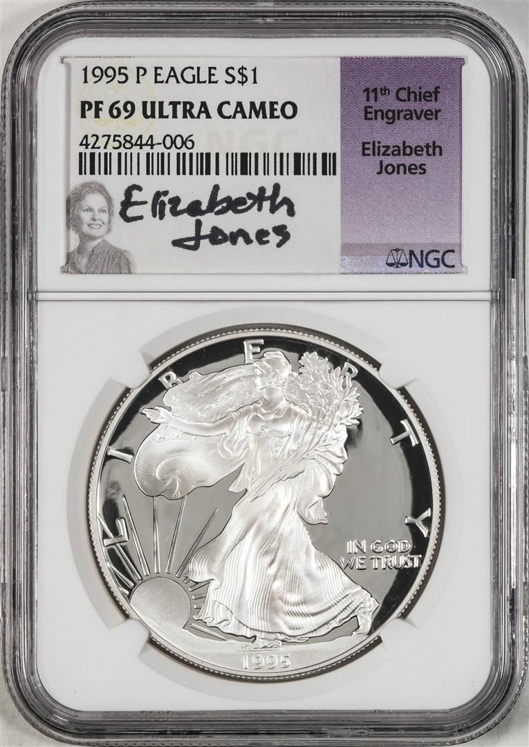 One 1995-P $1 Proof American Silver Eagle Coin NGC PF69 Ultra Cameo Elizabeth Jones Signature. NGC Certified.