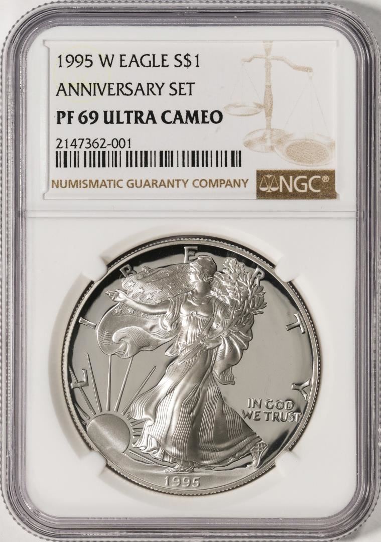 One 1995-W $1 Proof American Silver Eagle Coin NGC PF69 Ultra Cameo. NGC Certified.
