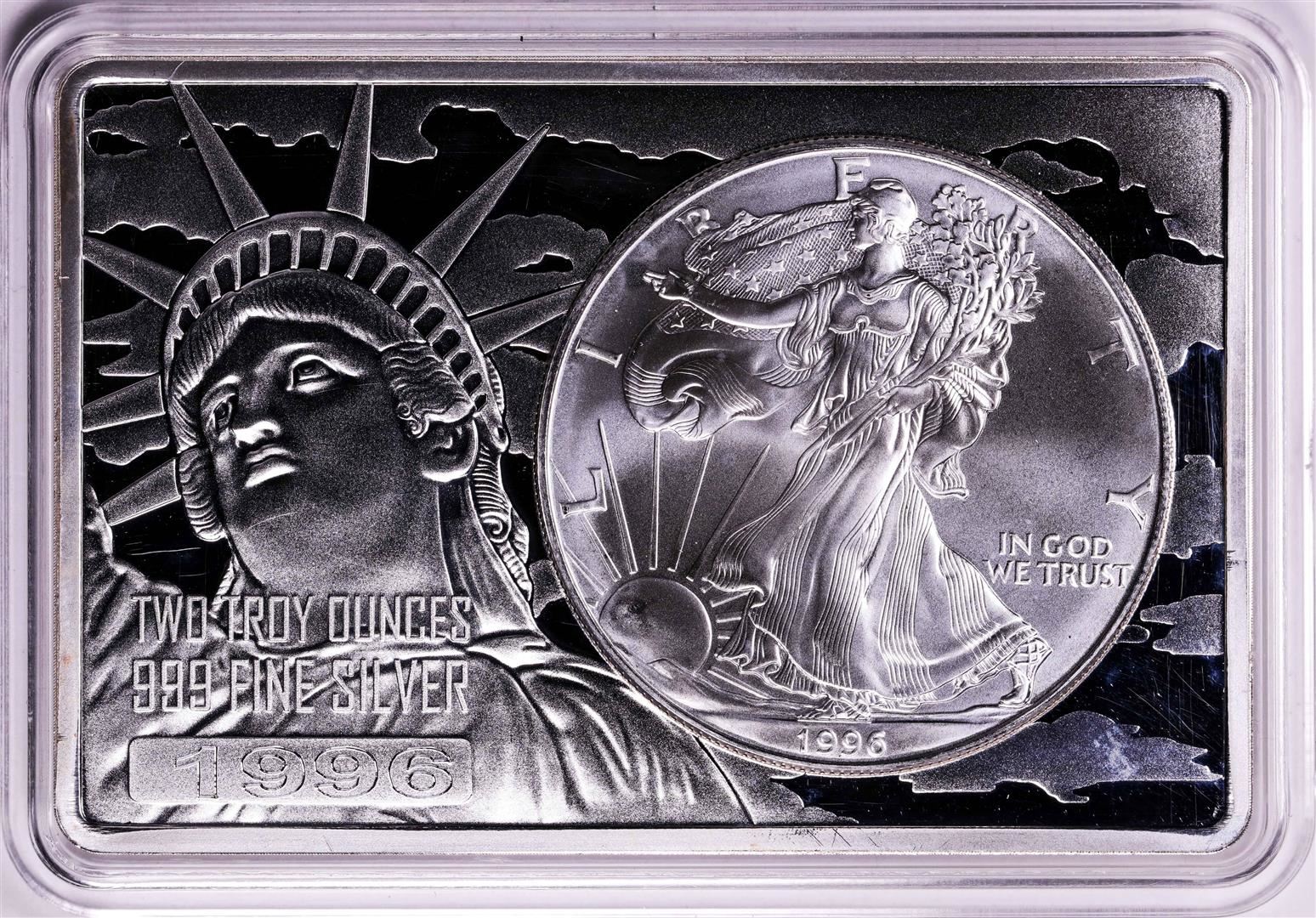 One 1996 $1 American Silver Eagle Coin & 2oz Silver Bar Set.