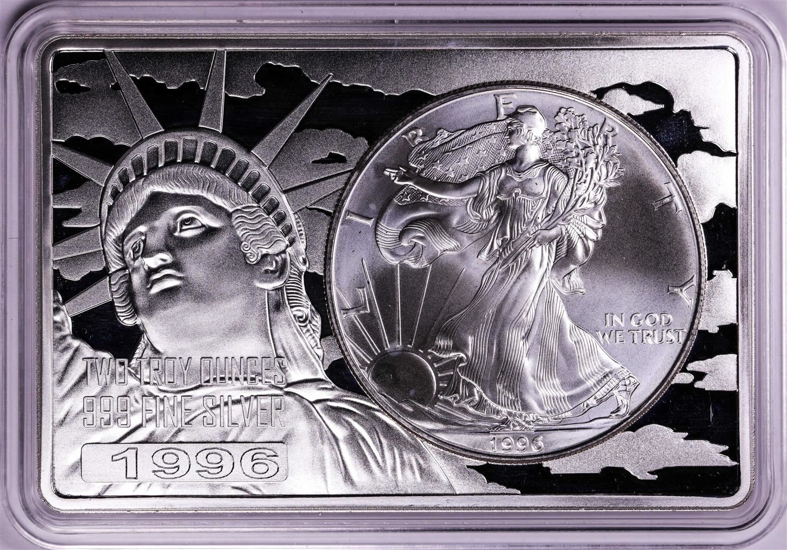 One 1996 $1 American Silver Eagle Coin & 2oz Silver Bar Set.