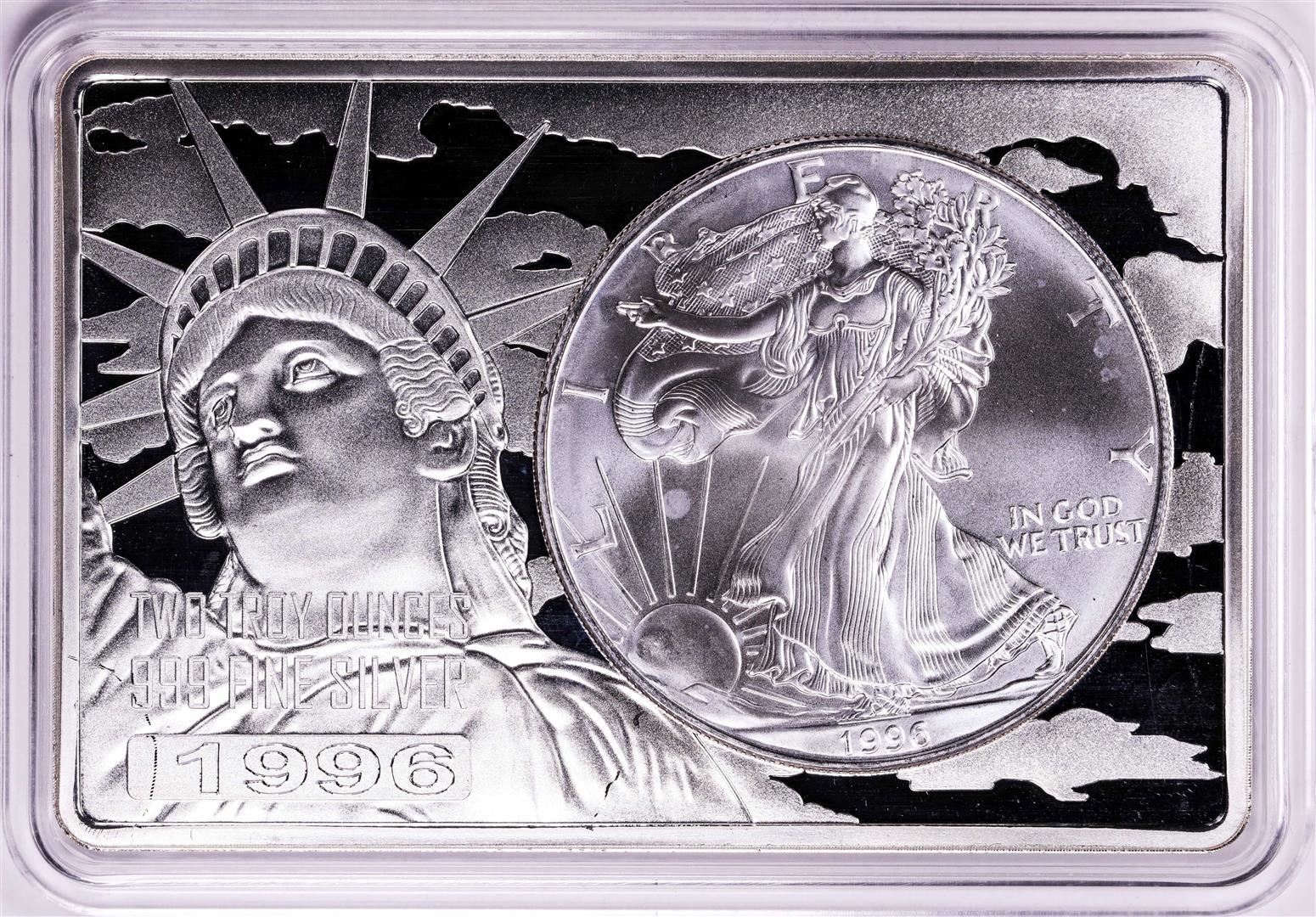 One 1996 $1 American Silver Eagle Coin & 2oz Silver Bar Set.