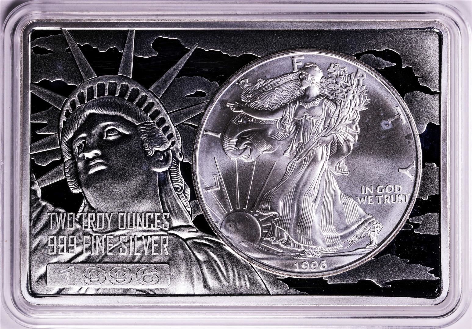 One 1996 $1 American Silver Eagle Coin & 2oz Silver Bar Set.