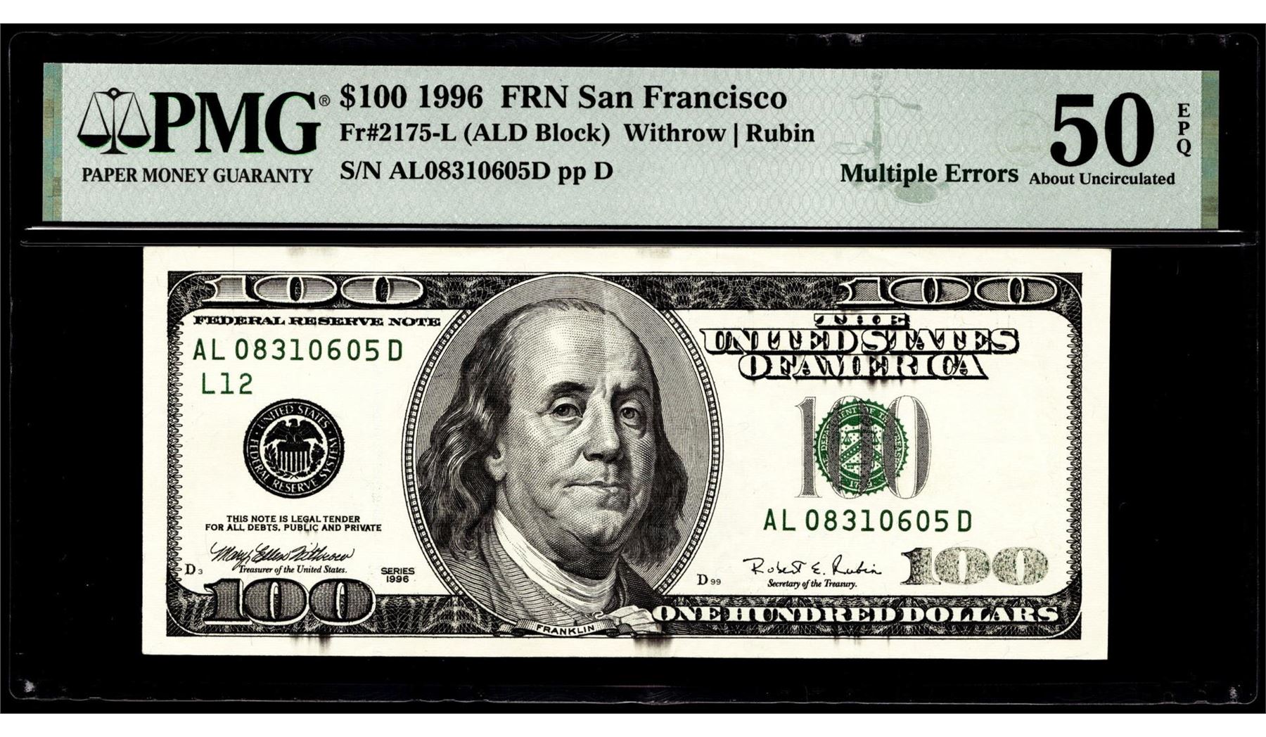 1996 $100 Federal Reserve Multiple Inking Errors Note PMG About Uncirculated 50EPQ