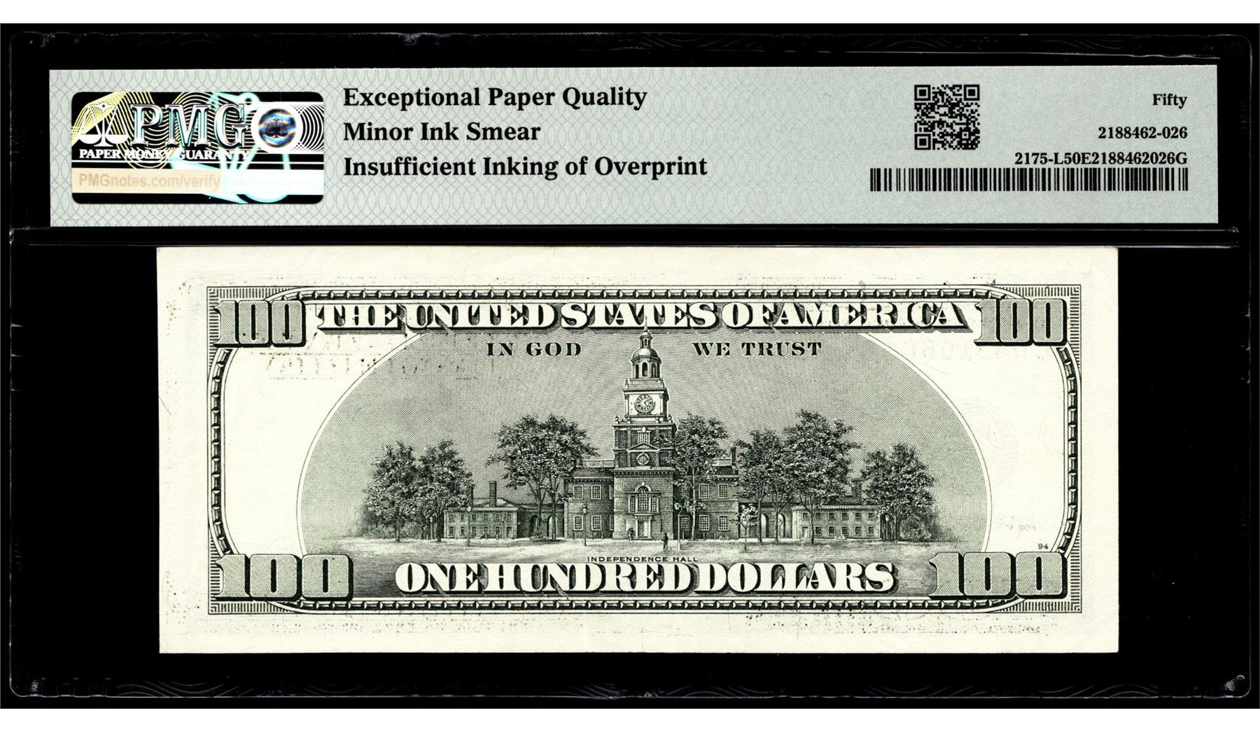 One 1996 $100 Federal Reserve Multiple Inking Errors Note PMG About Uncirculated 50EPQ. PMG Certified.