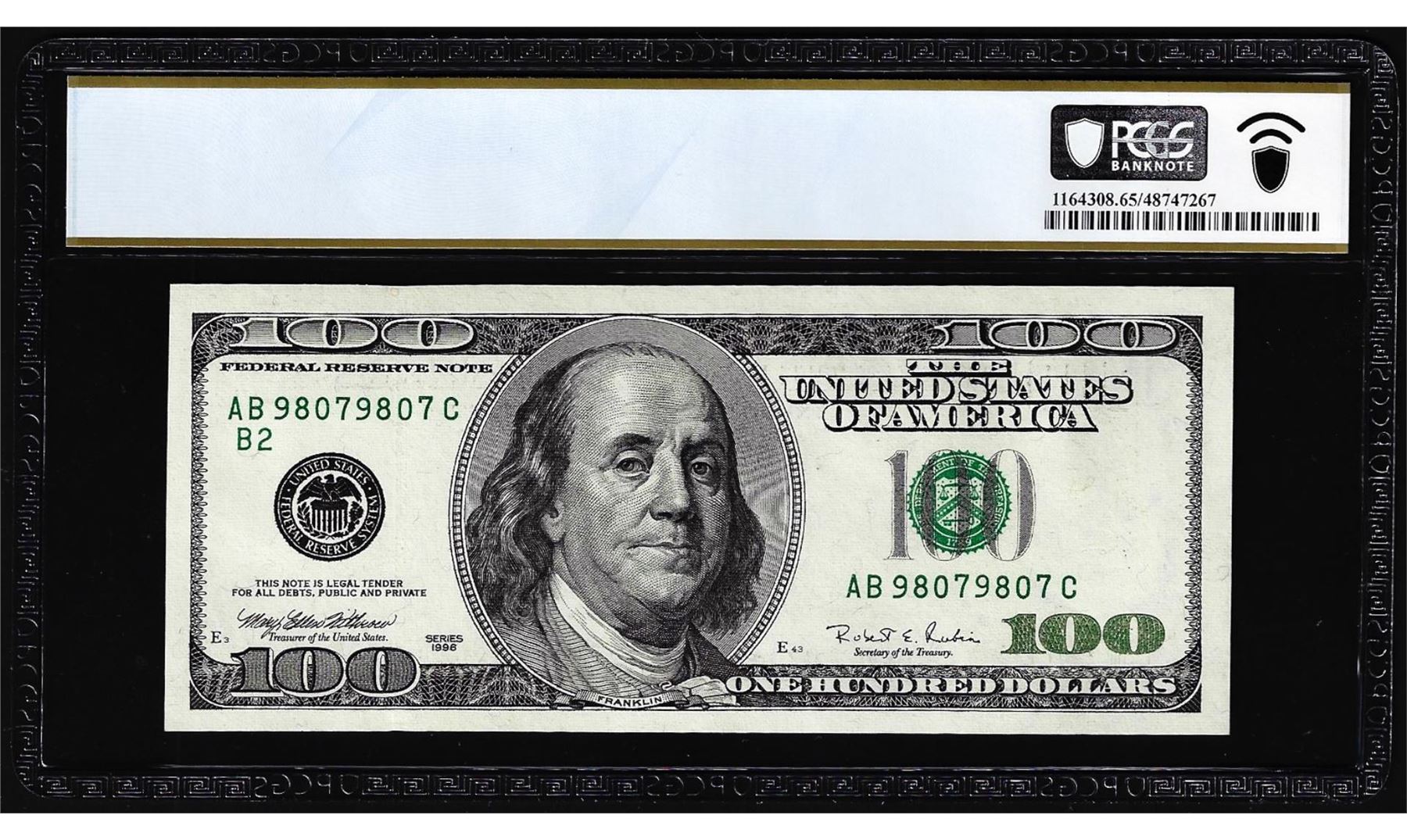 1996 $100 Federal Reserve Note Partial Offset Error PCGS Gem Unc 65PPQ Repeater Serial