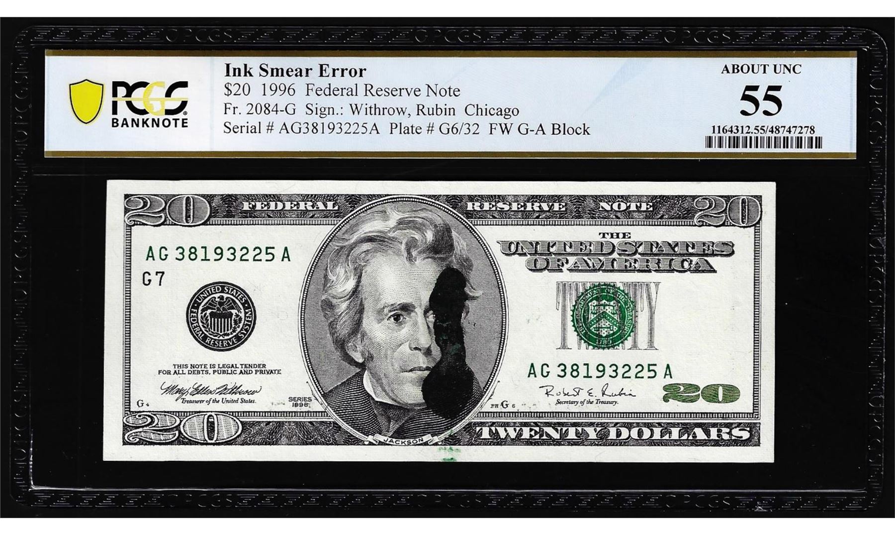 1996 $20 Federal Reserve Note Fr.2084-G Ink Smear Error PCGS About Uncirculated 55