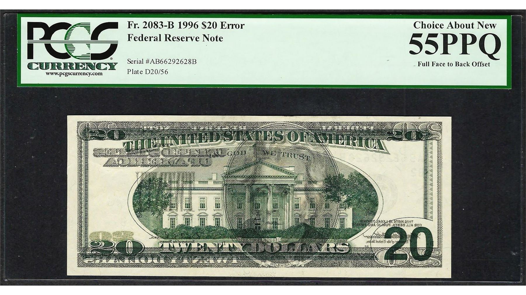 One 1996 $20 Federal Reserve Note Full Face Offset ERROR PCGS Choice About New 55PPQ. PCGS Graded.