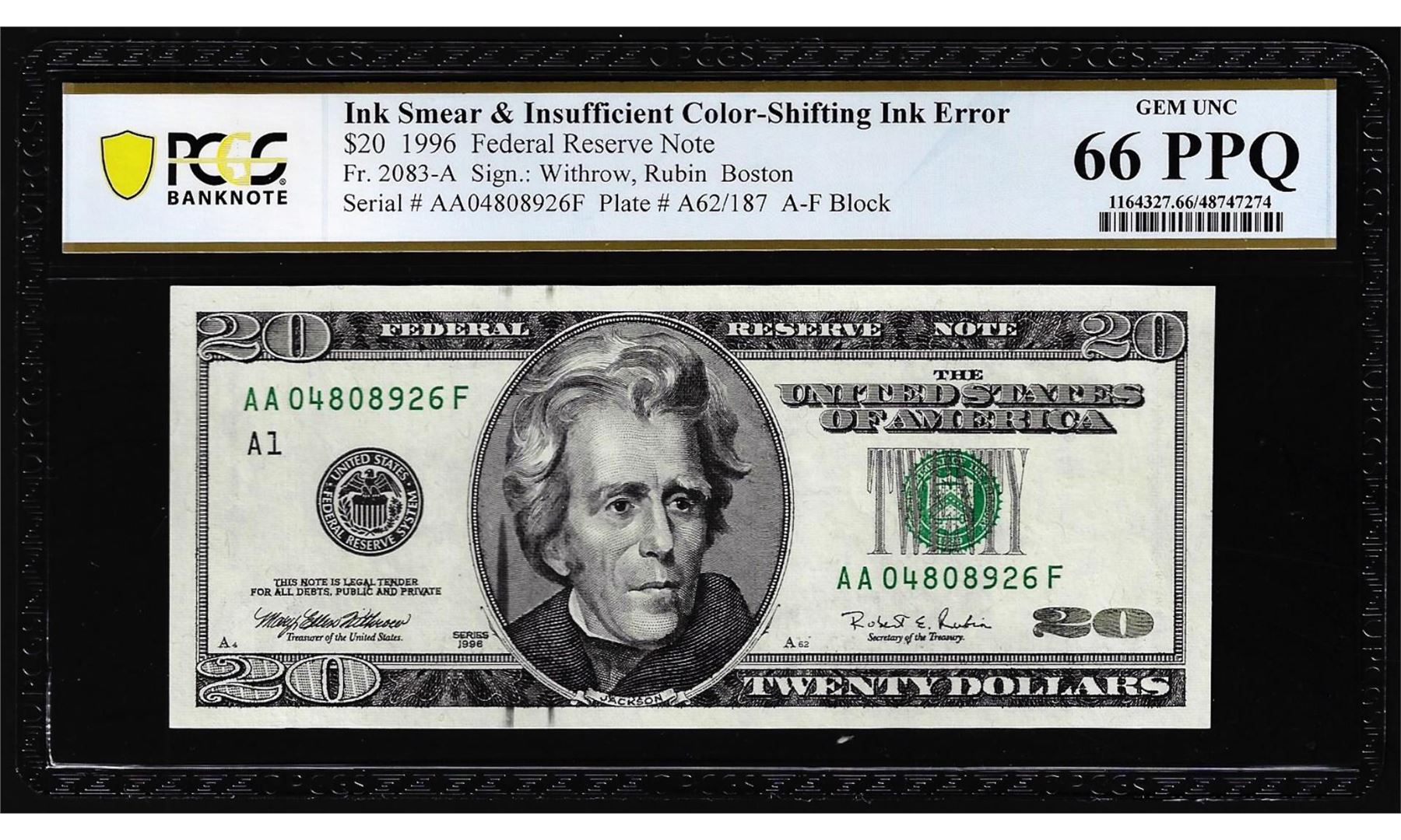 One 1996 $20 Federal Reserve Note Ink Smear & Insufficient Color Error PCGS Gem Unc 66PPQ. PCGS Graded.