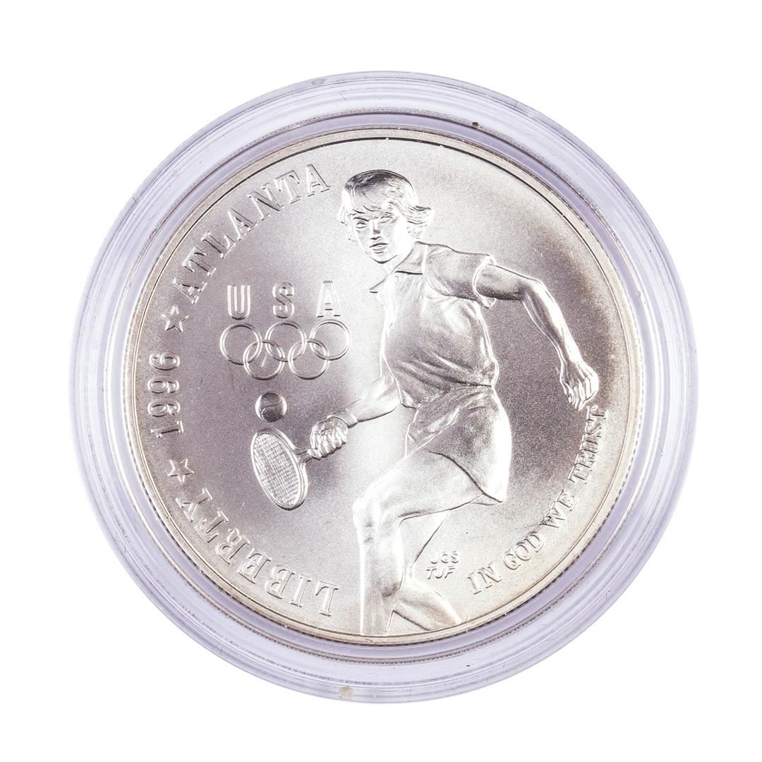 One 1996-D $1 Olympics Tennis Commemorative Silver Dollar Coin.