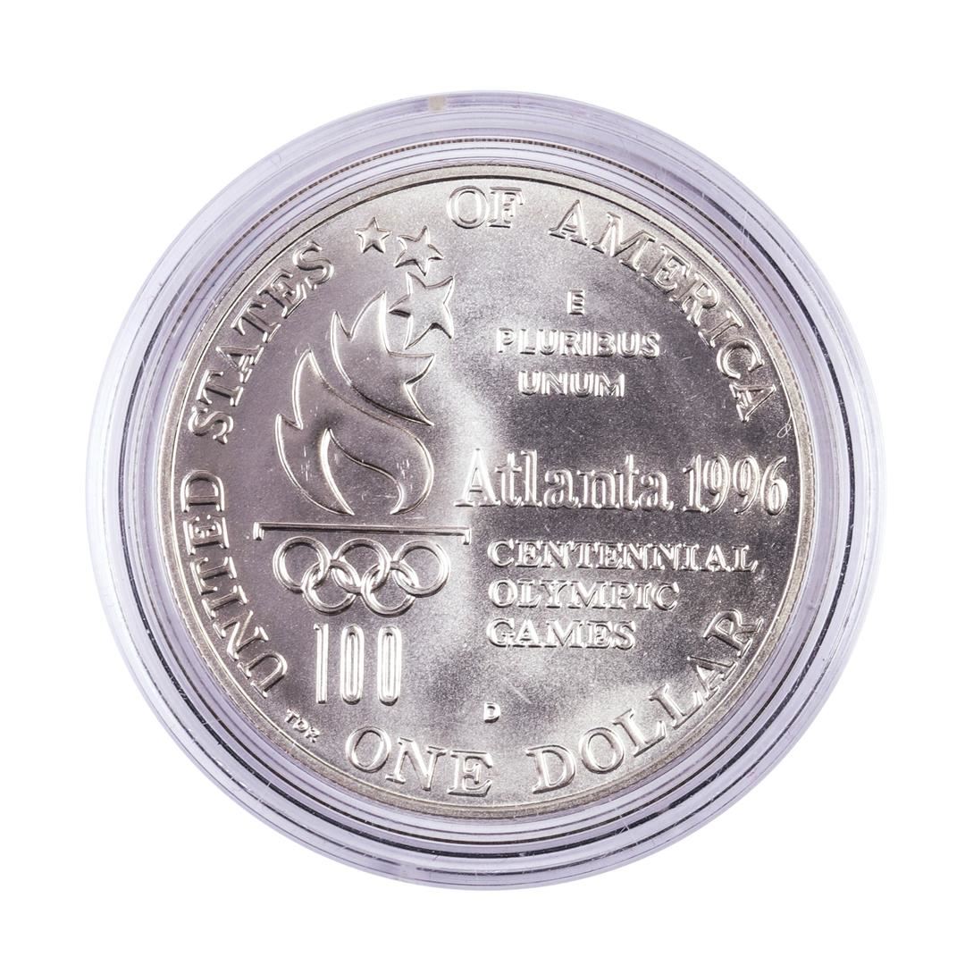 One 1996-D $1 Olympics Tennis Commemorative Silver Dollar Coin.