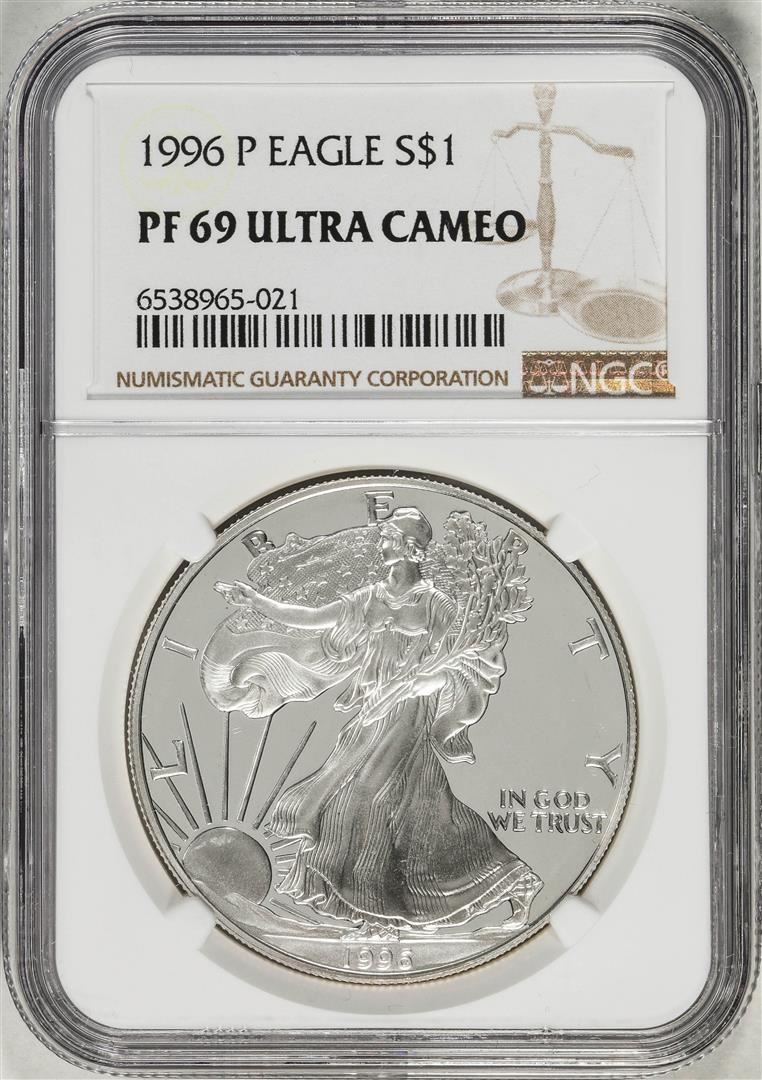 One 1996-P $1 Proof American Silver Eagle Coin NGC PF69 Ultra Cameo. NGC Certified.