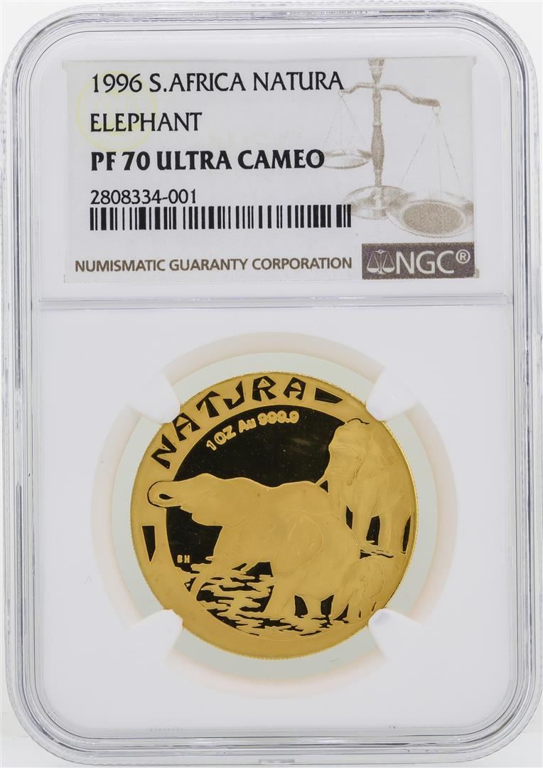 One 1996 South Africa Natura Elephant 1 oz Gold Coin NGC PF70 Ultra Cameo. NGC Certified.
