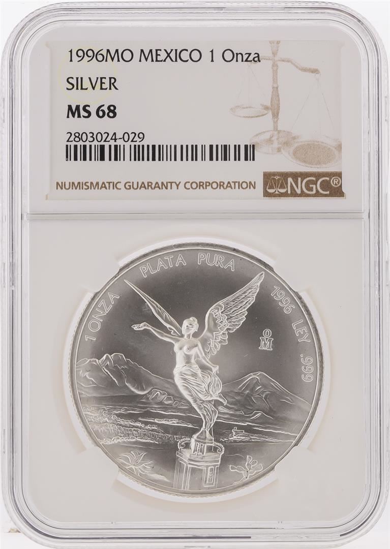 One 1996MO Mexico 1 Onza Libertad Silver Coin NGC Graded MS68. NGC Certified.