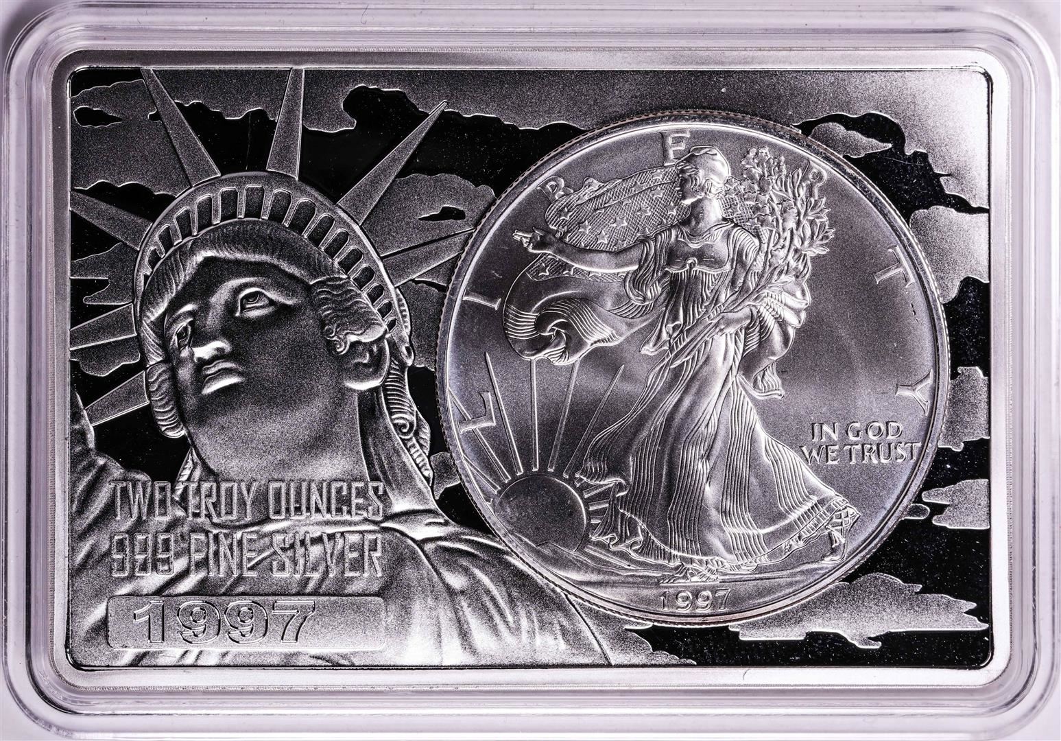 One 1997 $1 American Silver Eagle Coin & 2oz Silver Bar Set.