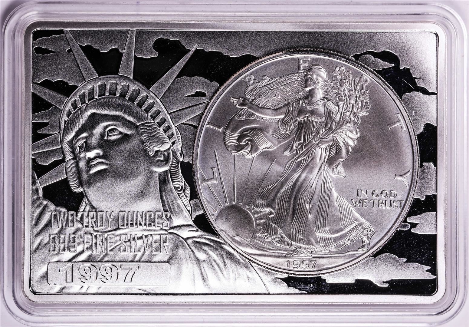 One 1997 $1 American Silver Eagle Coin & 2oz Silver Bar Set.