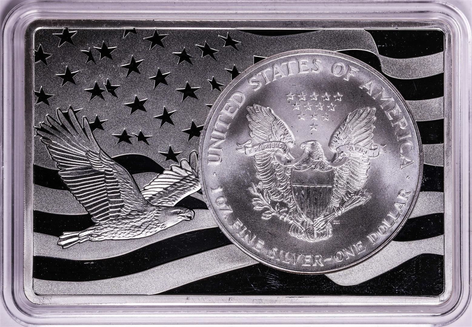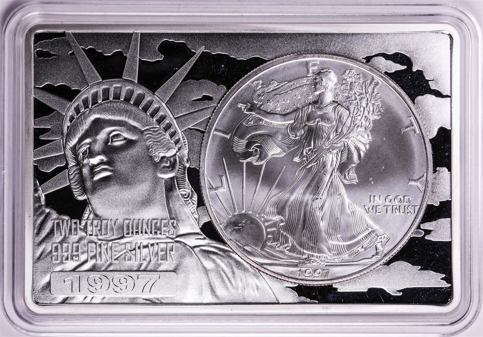 One 1997 $1 American Silver Eagle Coin & 2oz Silver Bar Set.
