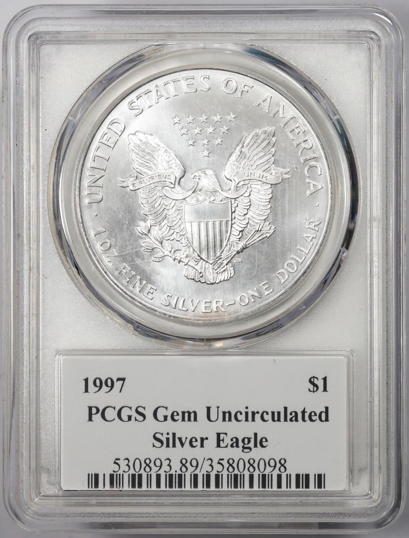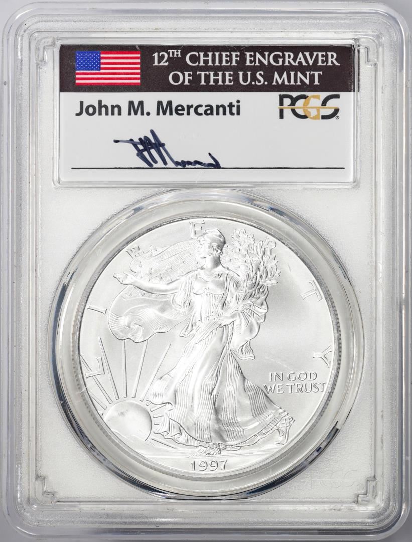 1997 $1 American Silver Eagle Coin PCGS Gem Uncirculated Mercanti Signature