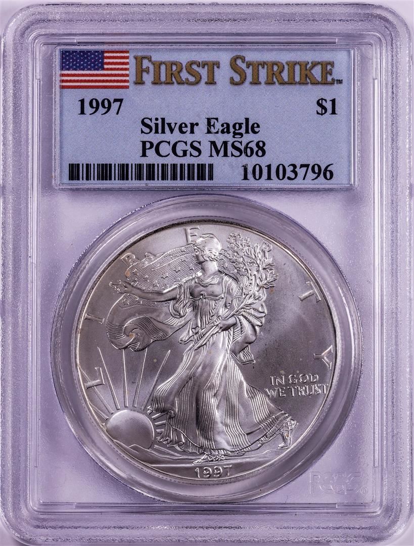 One 1997 $1 American Silver Eagle Coin PCGS MS68 First Strike. PCGS Graded.