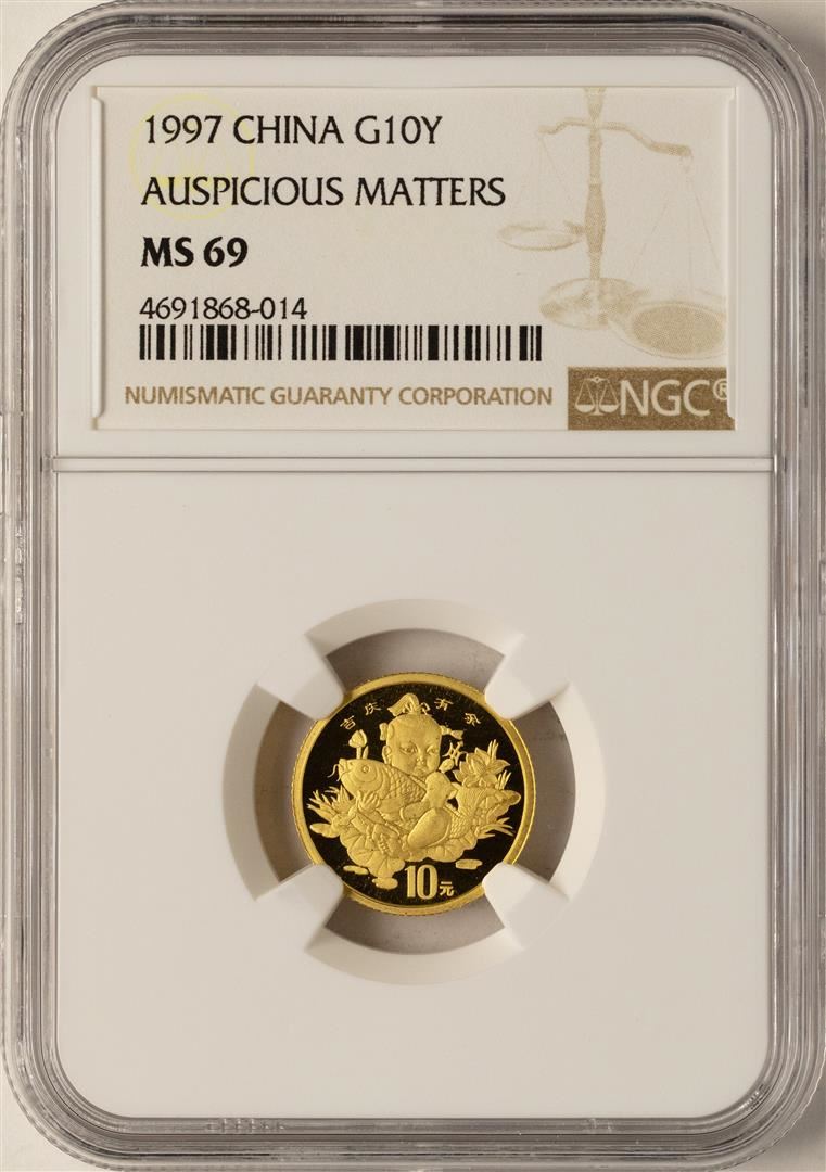 One 1997 China 10 Yuan Auspicious Matters Gold Coin NGC MS69. NGC Certified.