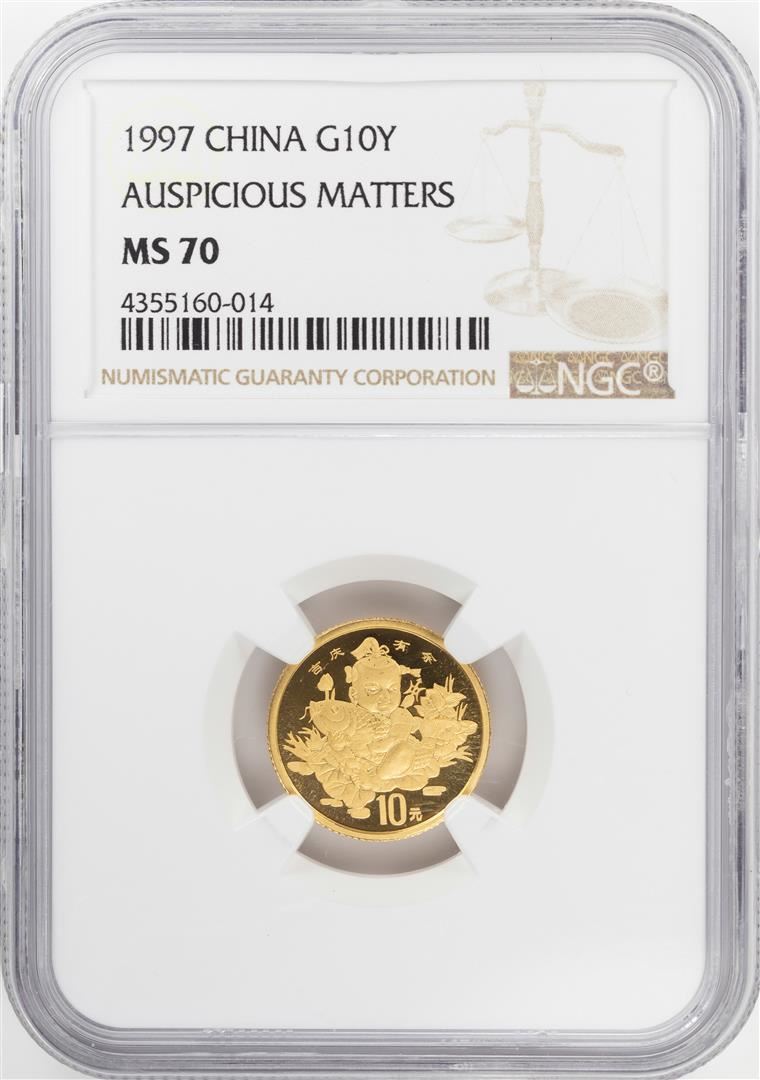 One 1997 China 10 Yuan Auspicious Matters Gold Coin NGC MS70. NGC Certified.