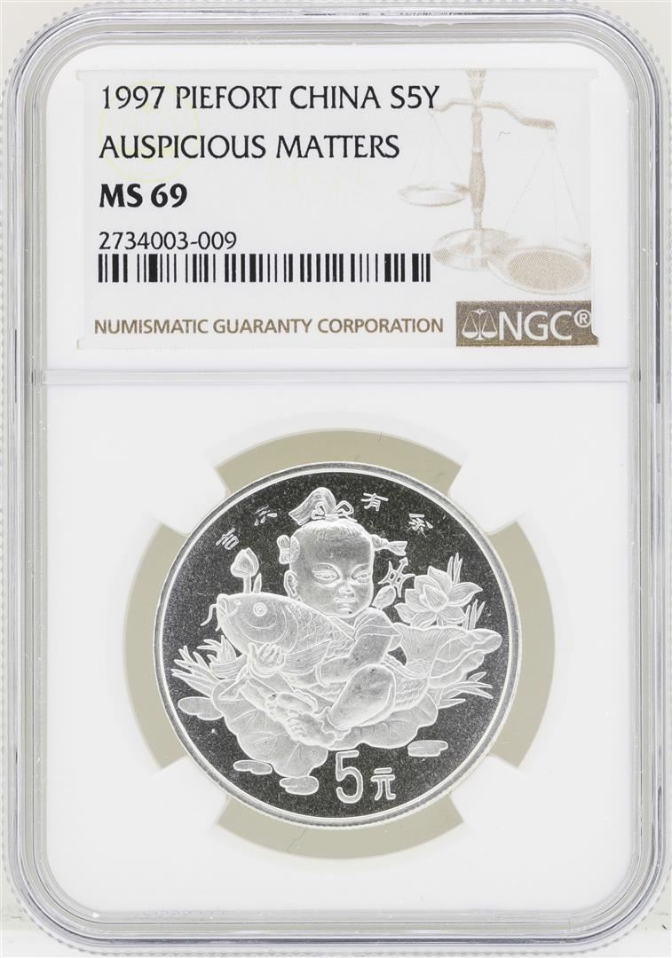 One 1997 China 5 Yuan Piefort Auspicious Matters Silver Coin NGC MS69. NGC Certified.