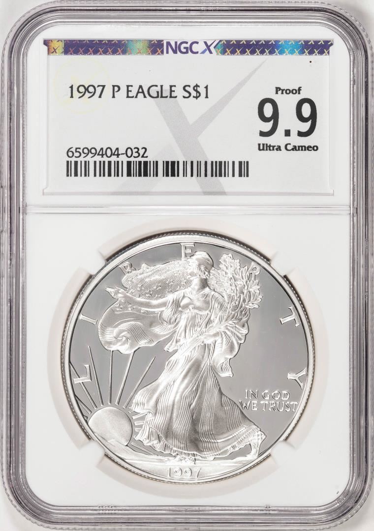 One 1997-P $1 Proof American Silver Eagle Coin NGCX Proof 9.9 Ultra Cameo. NGCX Certified.
