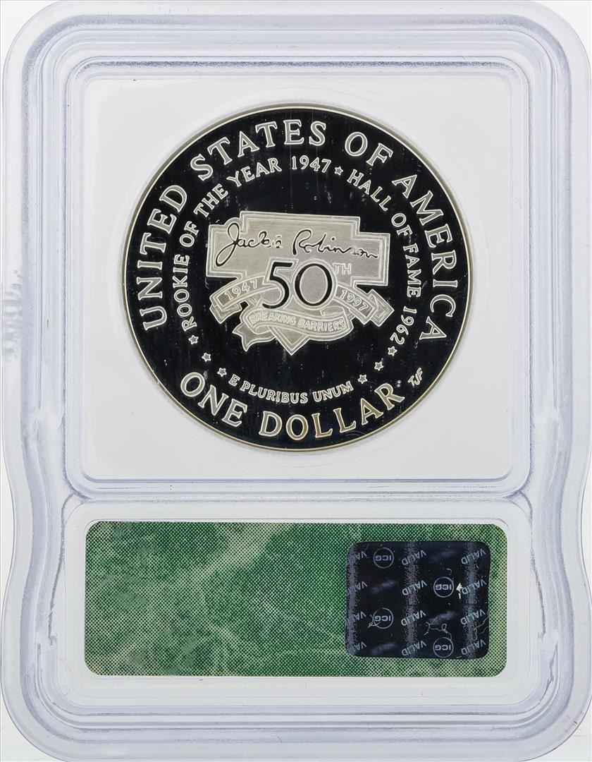 One 1997-S $1 Jackie Robinson Silver Coin ICG PR70 DCAM. ICG Certified.