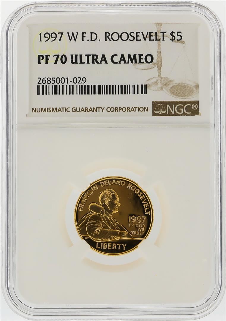 One 1997-W $5 Franklin D. Roosevelt Commemorative Gold Coin NGC PF70 Ultra Cameo. NGC Certified.