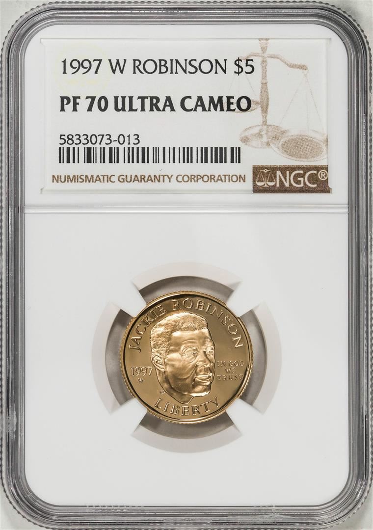 One 1997-W $5 Jackie Robinson Proof Commemorative Gold Coin NGC PF70 Ultra Cameo. NGC Certified.