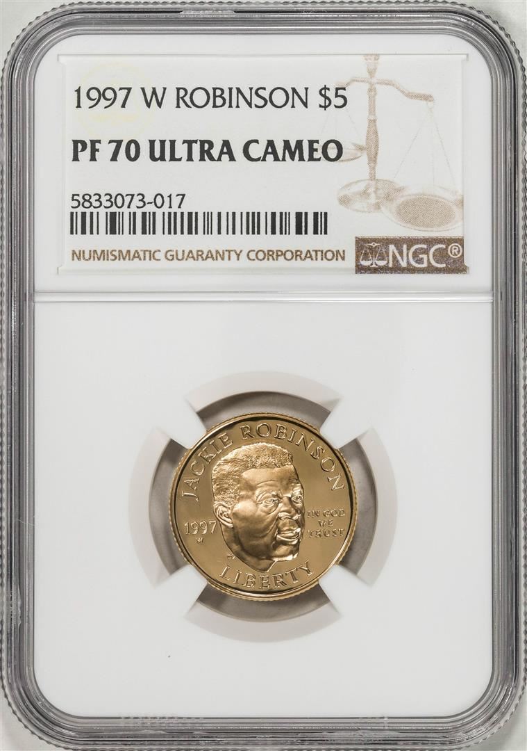 One 1997-W $5 Jackie Robinson Proof Commemorative Gold Coin NGC PF70 Ultra Cameo. NGC Certified.