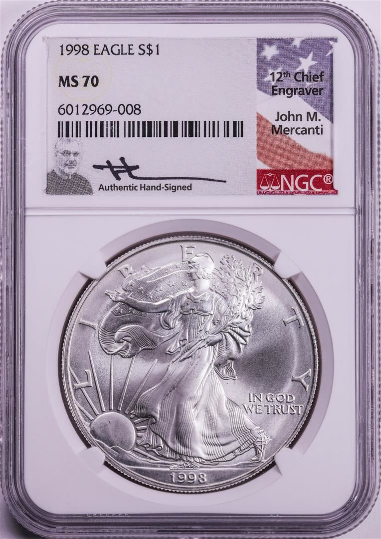 One 1998 $1 American Silver Eagle Coin NGC MS70 John Mercanti Signature. NGC Certified.