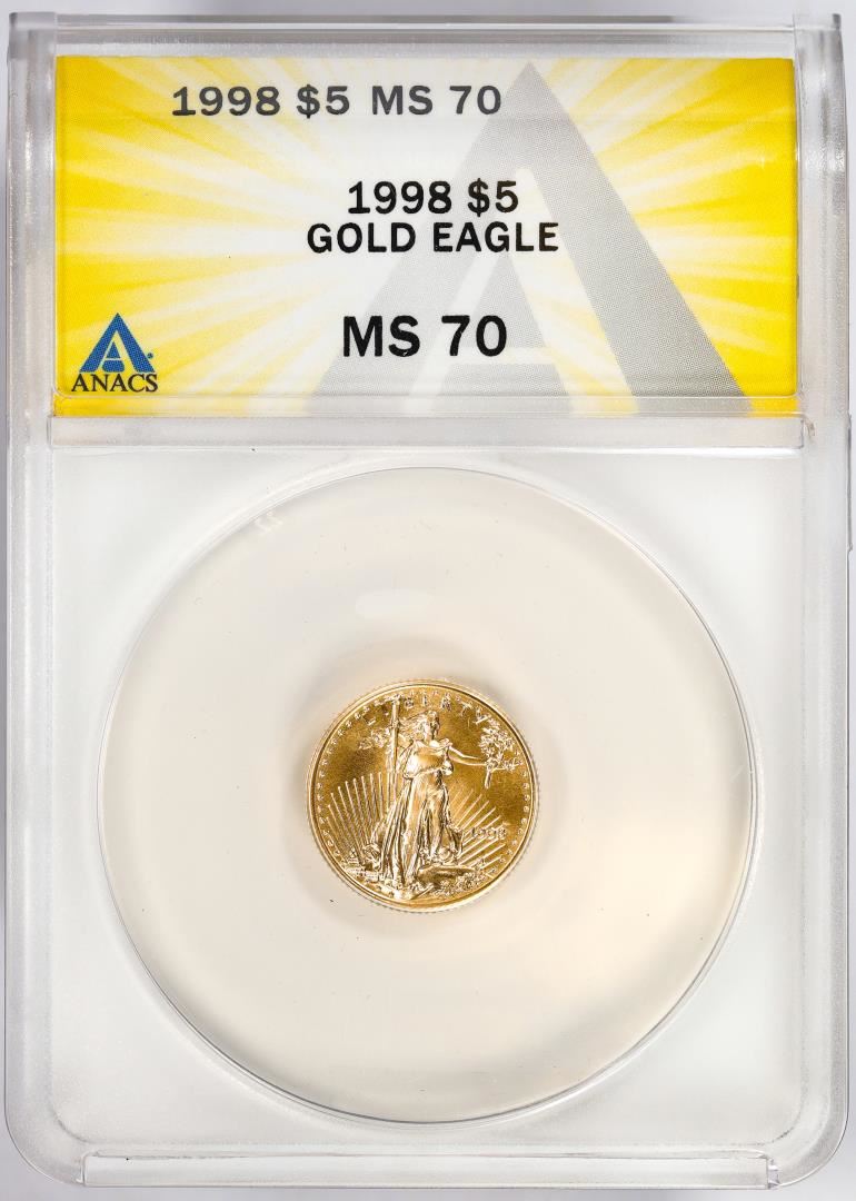 One 1998 $5 American Gold Eagle Coin ANACS MS70. ANACS Certified.