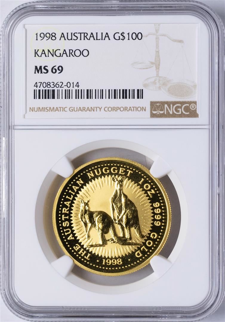 One 1998 Australia $100 Gold Kangaroo Coin NGC MS69. NGC Certified.