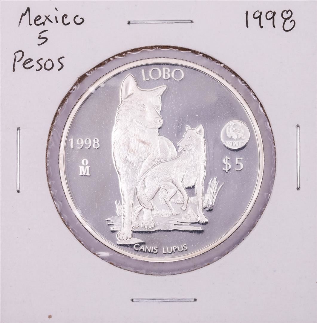 One 1998 Mexico 5 Pesos Proof Canis Lupus Silver Coin.
