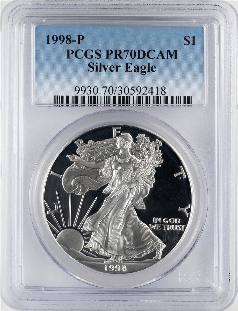 One 1998-P $1 Proof American Silver Eagle Coin PCGS PR70DCAM. PCGS Graded.