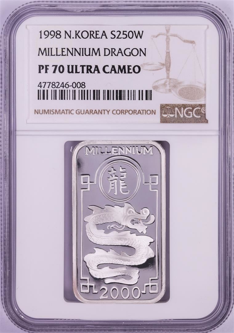 One 1998 Proof N. Korea 250 Won Millennium Dragon 20 Gram Silver Bar NGC PF70 Ultra Cameo. NGC Certified.