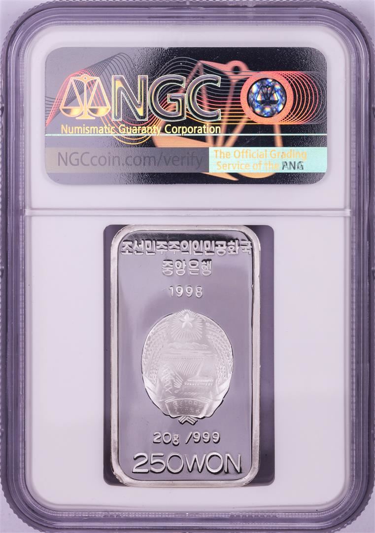 One 1998 Proof N. Korea 250 Won Millennium Dragon 20 Gram Silver Bar NGC PF70 Ultra Cameo. NGC Certified.