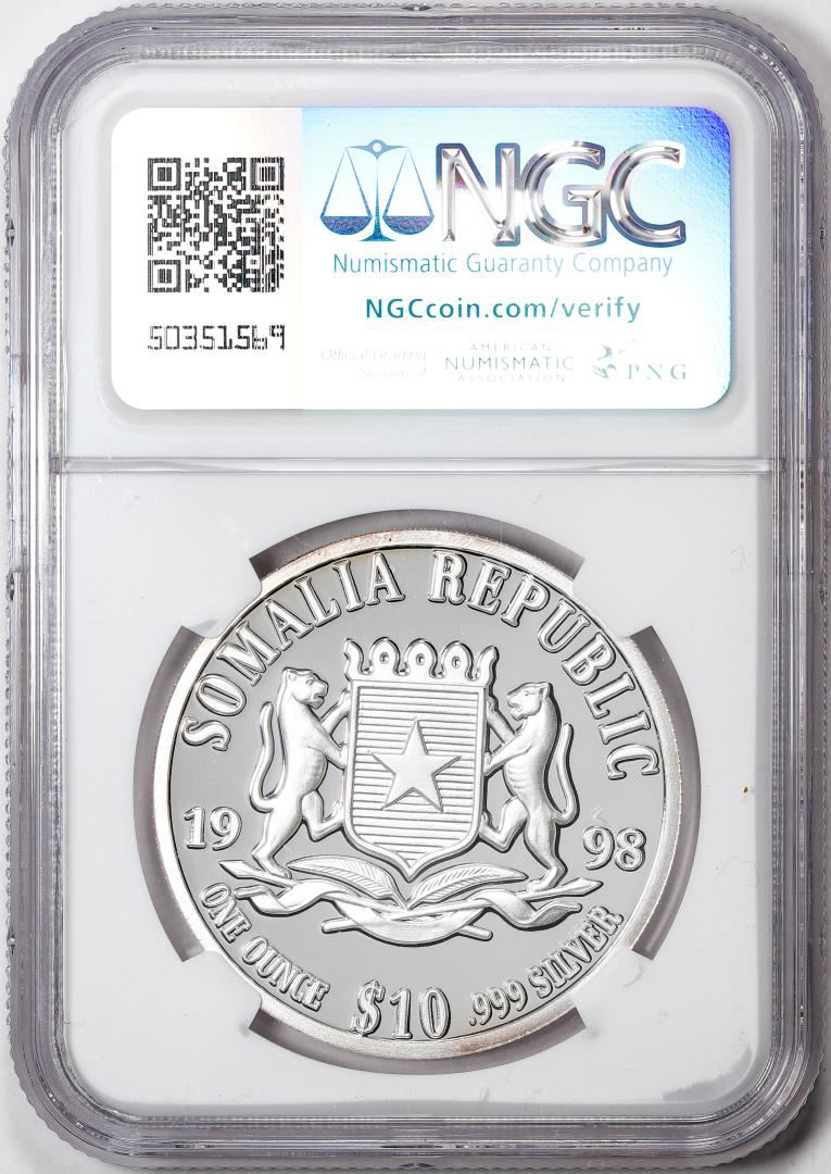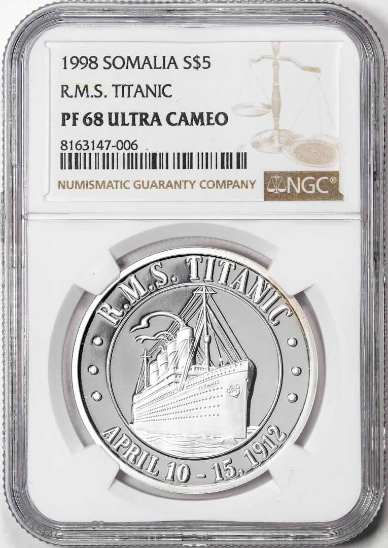 One 1998 Somalia $5 Proof R.M.S. Titanic Silver Coin NGC PF68 Ultra Cameo. NGC Certified.