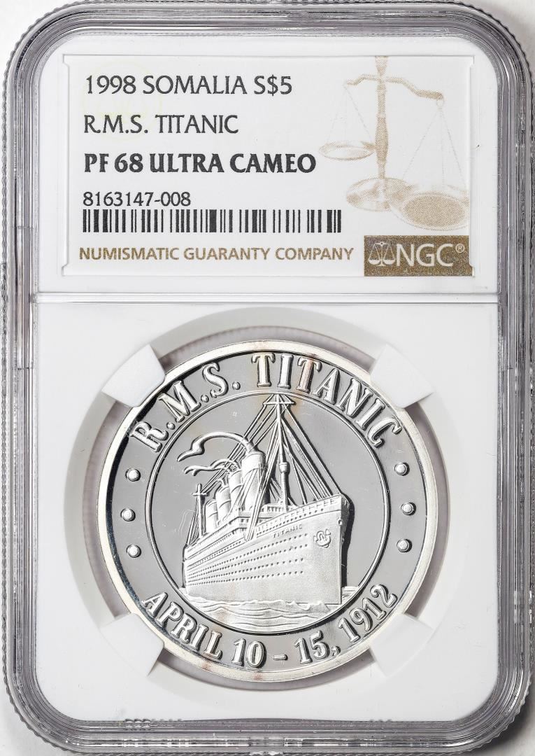 One 1998 Somalia $5 Proof R.M.S. Titanic Silver Coin NGC PF68 Ultra Cameo. NGC Certified.
