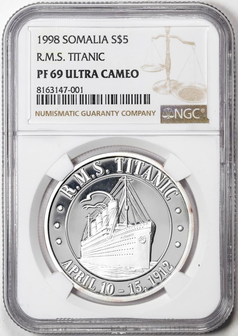 One 1998 Somalia $5 Proof R.M.S. Titanic Silver Coin NGC PF69 Ultra Cameo. NGC Certified.