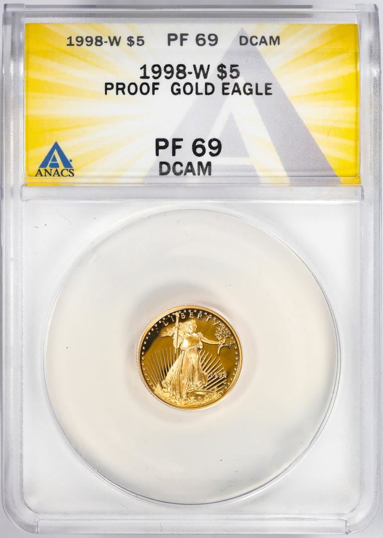 One 1998-W $5 Proof American Gold Eagle Coin ANACS PF69DCAM. ANACS Certified.