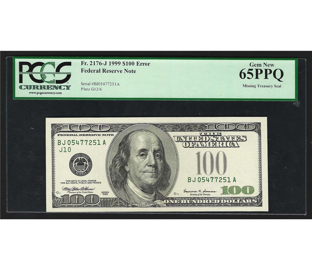1999 $100 Federal Reserve Note PCGS Gem New 65PPQ ERROR Missing Treasury Seal